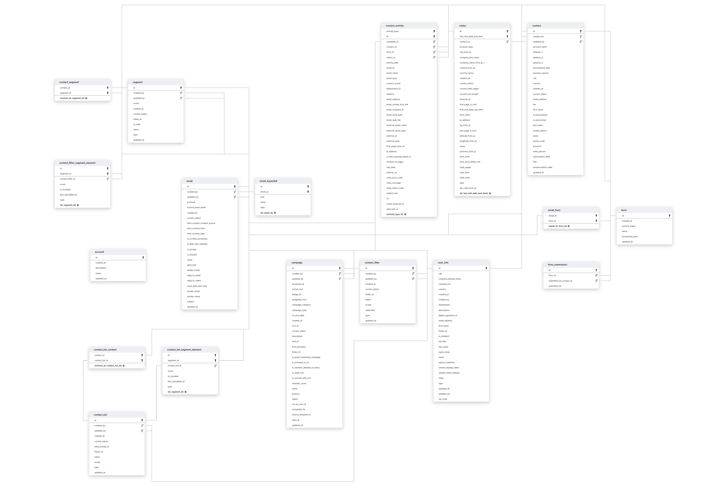 ACCOUNTCAMPAIGNCONTACTCONTACT_FILTERCONTACT_FILTER_SEGMENT_ELEMENTCONTACT_LISTCONTACT_LIST_SEGMENT_ELEMENTEMAILEMAIL_FORMEMAIL_HYPERLINKFORMFORM_SUBMISSIONSEGMENTUSER_INFOVISITOR