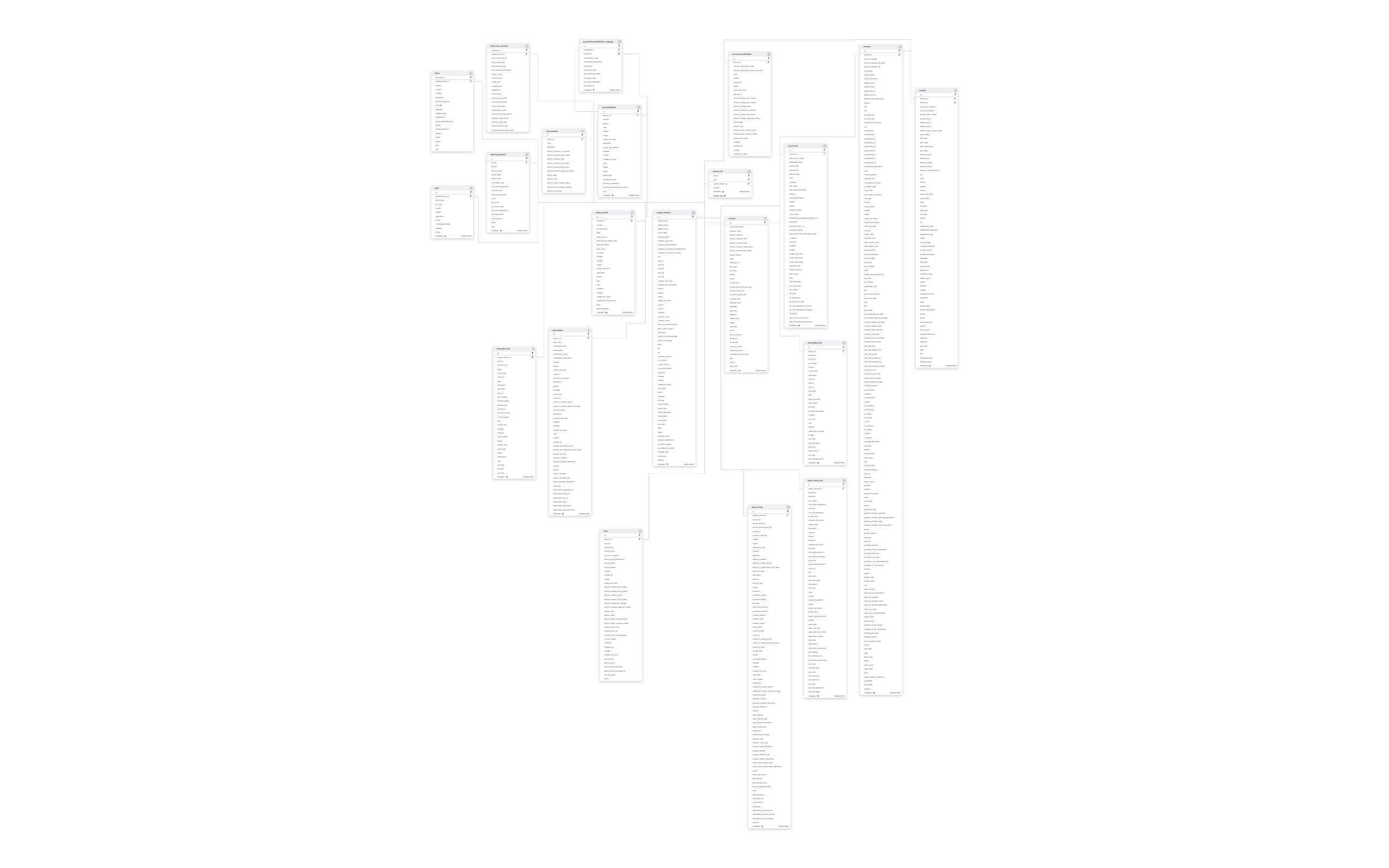 ACCOUNTACCOUNT_CLASSIFICATIONBANKBANK_ACCOUNTCONTACTGL_ACCOUNTGL_CLASSIFICATIONSUBSCRIPTIONSUBSCRIPTION_LINESYSTEM_DIVISIONTRANSACTION_LINEUSERS