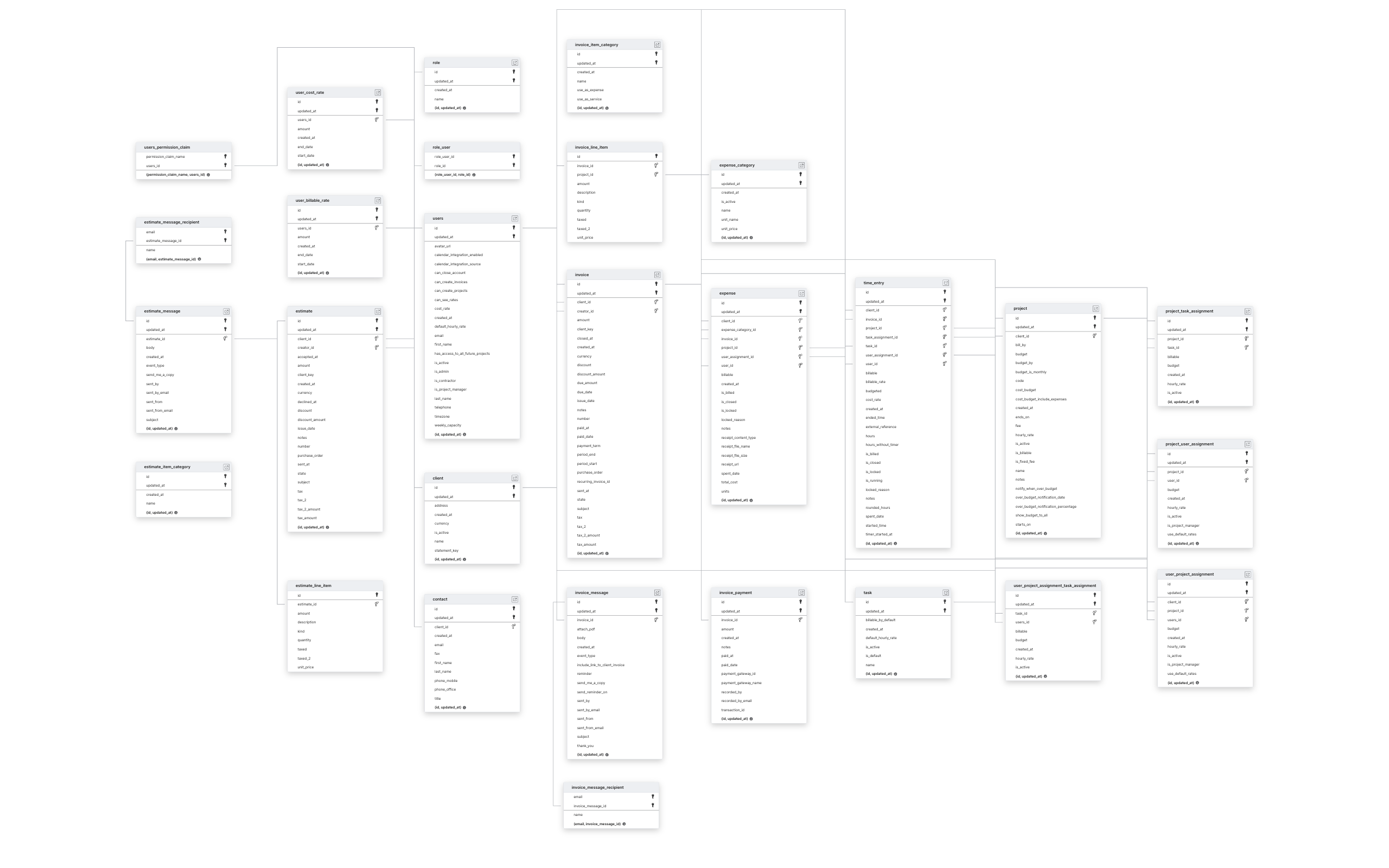 CLIENTCONTACTESTIMATEESTIMATE_ITEM_CATEGORYESTIMATE_MESSAGEEXPENSEEXPENSE_CATEGORYINVOICEINVOICE_ITEM_CATEGORYINVOICE_MESSAGEINVOICE_PAYMENTPROJECTPROJECT_TASK_ASSIGNMENTPROJECT_USER_ASSIGNMENTROLETASKTIME_ENTRYUSERSUSER_BILLABLE_RATEUSER_COST_RATEUSER_PROJECT_ASSIGNMENT