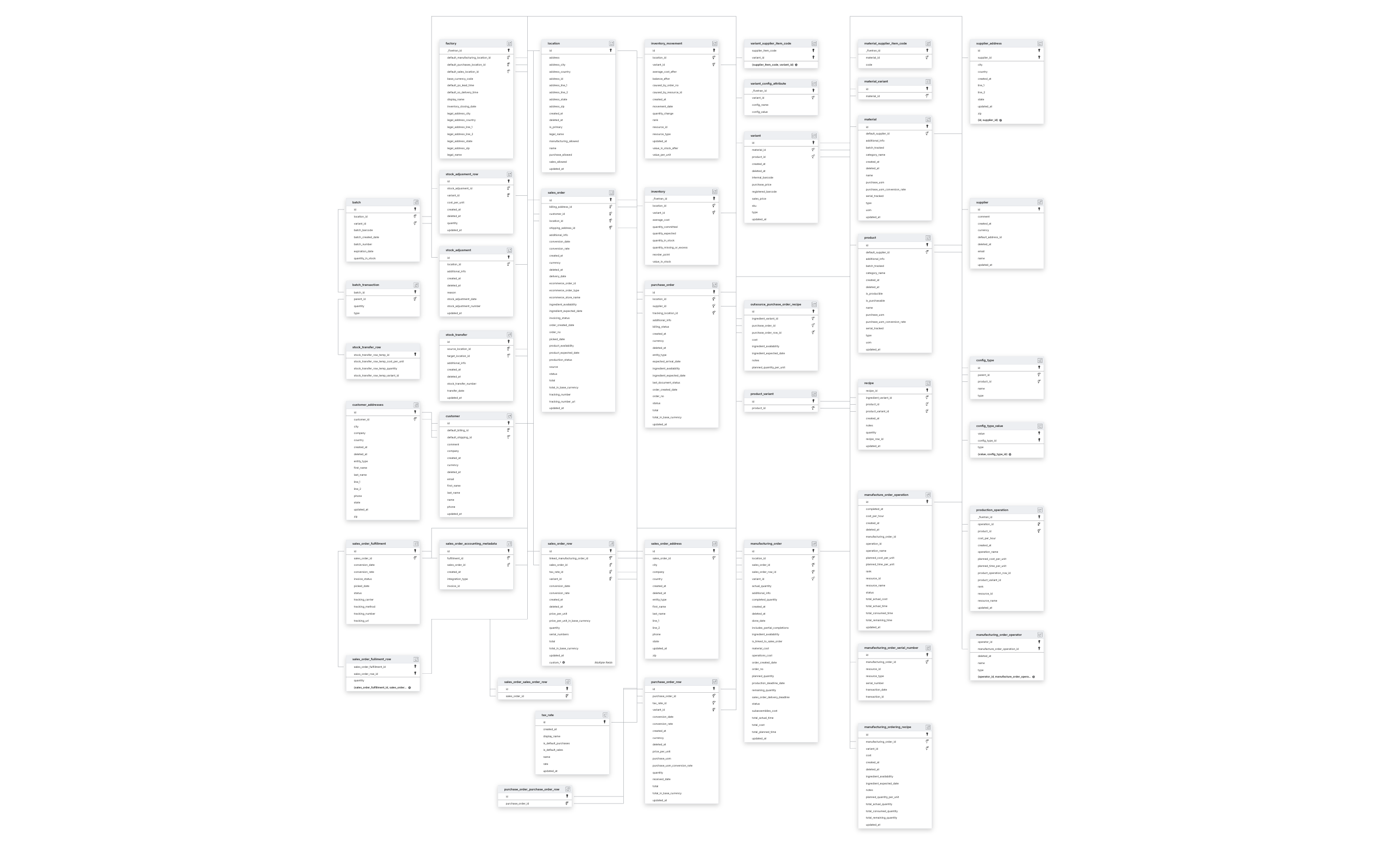 CUSTOMERCUSTOMER_ADDRESSESINVENTORY_MOVEMENTLOCATIONMANUFACTURING_ORDERMANUFACTURE_ORDER_OPERATIONMANUFACTURING_ORDERING_RECIPEMATERIALOUTSOURCE_PURCHASE_ORDER_RECIPEPRODUCTPRODUCTION_OPERATIONPURCHASE_ORDERPURCHASE_ORDER_ROWRECIPESALES_ORDERSALES_ORDER_ADDRESSSALES_ORDER_FULFILLMENTSALES_ORDER_ROWSTOCK_ADJUSMENTSTOCK_TRANSFERSUPPLIERTAX_RATEVARIANT