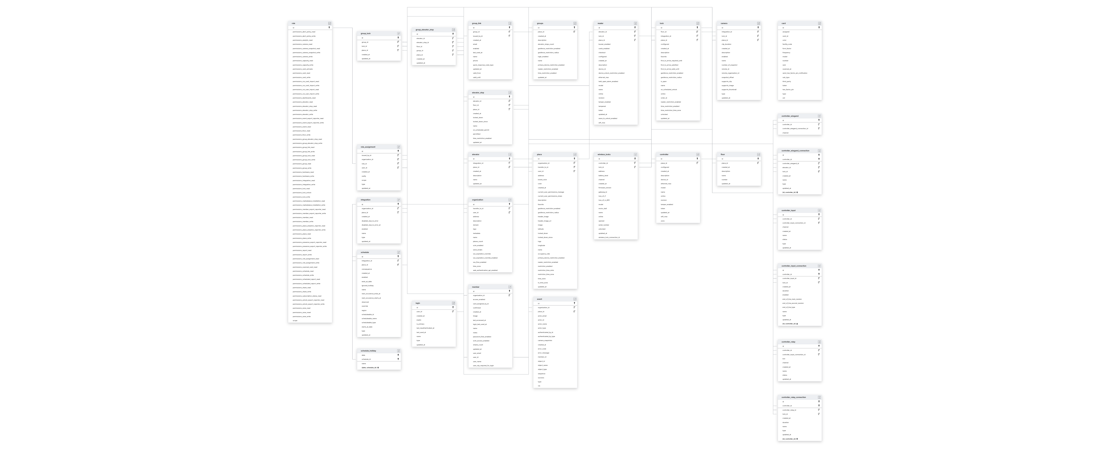 | Capture deletes | check | CAMERA, CARD, CONTROLLER, CONTROLLER_INPUT, CONTROLLER_INPUT_CONNECTION, CONTROLLER_RELAY, CONTROLLER_RELAY_CONNECTION, CONTROLLER_WIEGAND, CONTROLLER_WIEGAND_CONNECTION, ELEVATOR, ELEVATOR_STOP, FLOOR, GROUPS, GROUP_ELEVATOR_STOP, GROUP_LINK, GROUP_LOCK, INTEGRATION, LOCK, LOGIN, MEMBER, ORGANIZATION, PLACE, READER, ROLE, ROLE_ASSIGNMENT, SCHEDULE, and WIRELESS_LOCKS tables. |