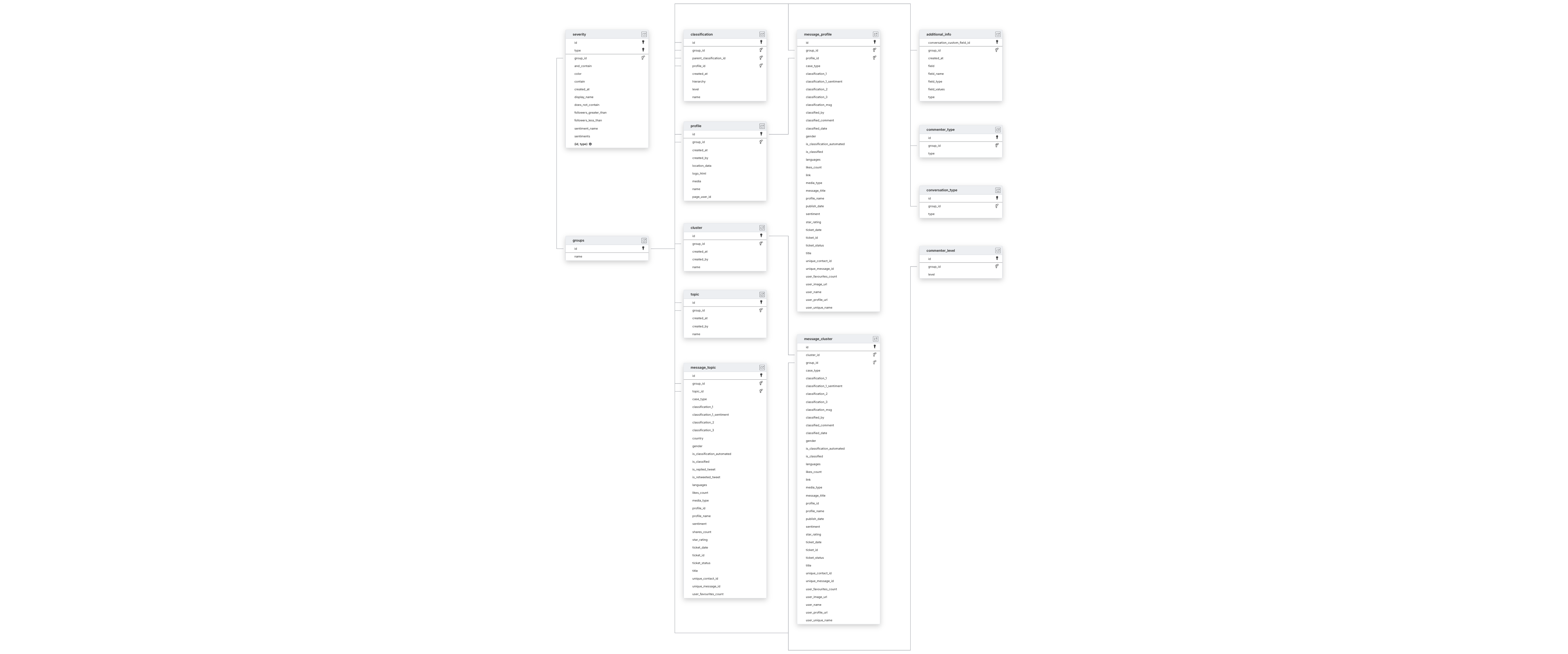| Capture deletes | check | ADDITIONAL_INFO, CLASSIFICATION, CLUSTER, COMMENTER_LEVEL, COMMENTER_TYPE, CONVERSATION_TYPE, GROUPS, PROFILE, SEVERITY, and TOPIC tables. |
