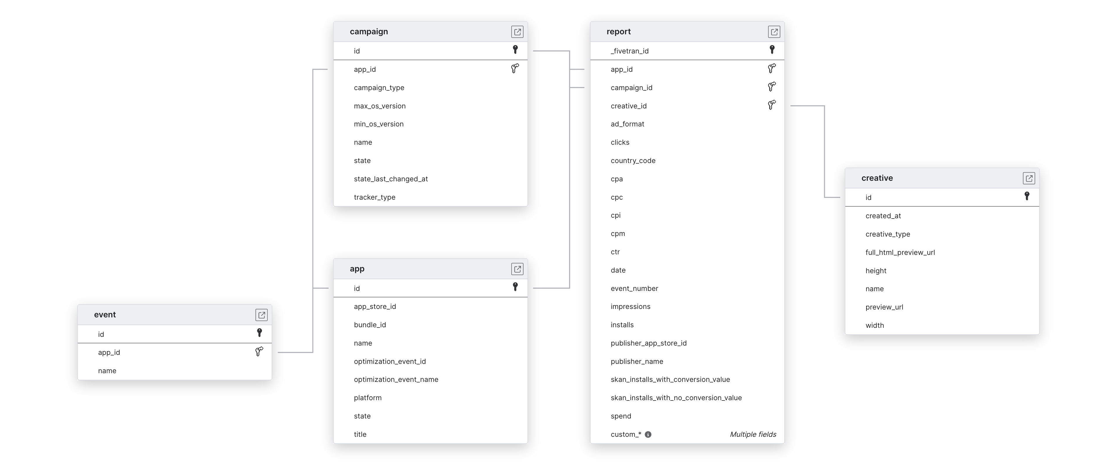 | Capture deletes | check | APP, CAMPAIGN, CREATIVE, and EVENT tables. |