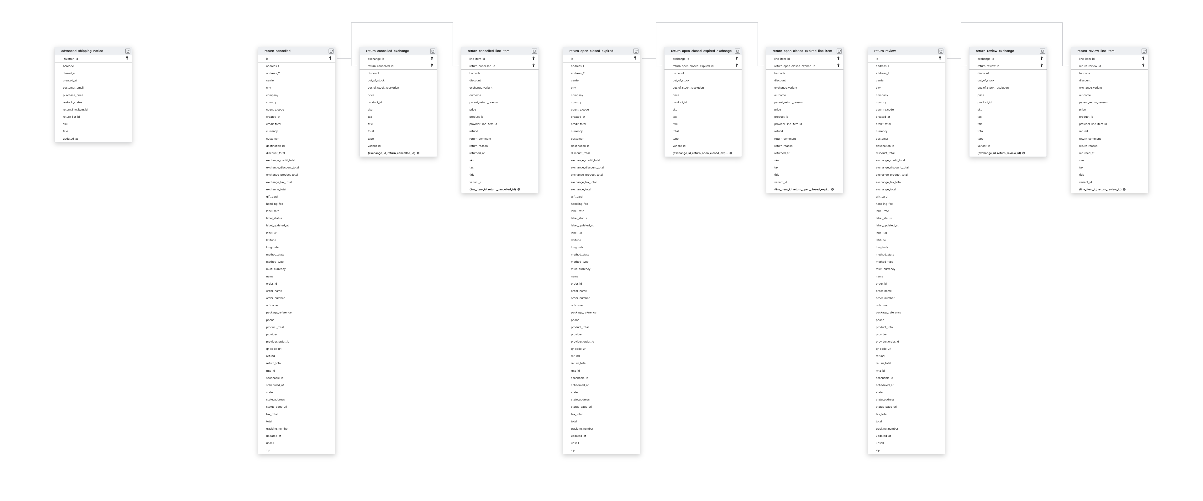 To capture new records, we incrementally sync the ADVANCED_SHIPPING_NOTICE and RETURN_LIST tables and their child tables.