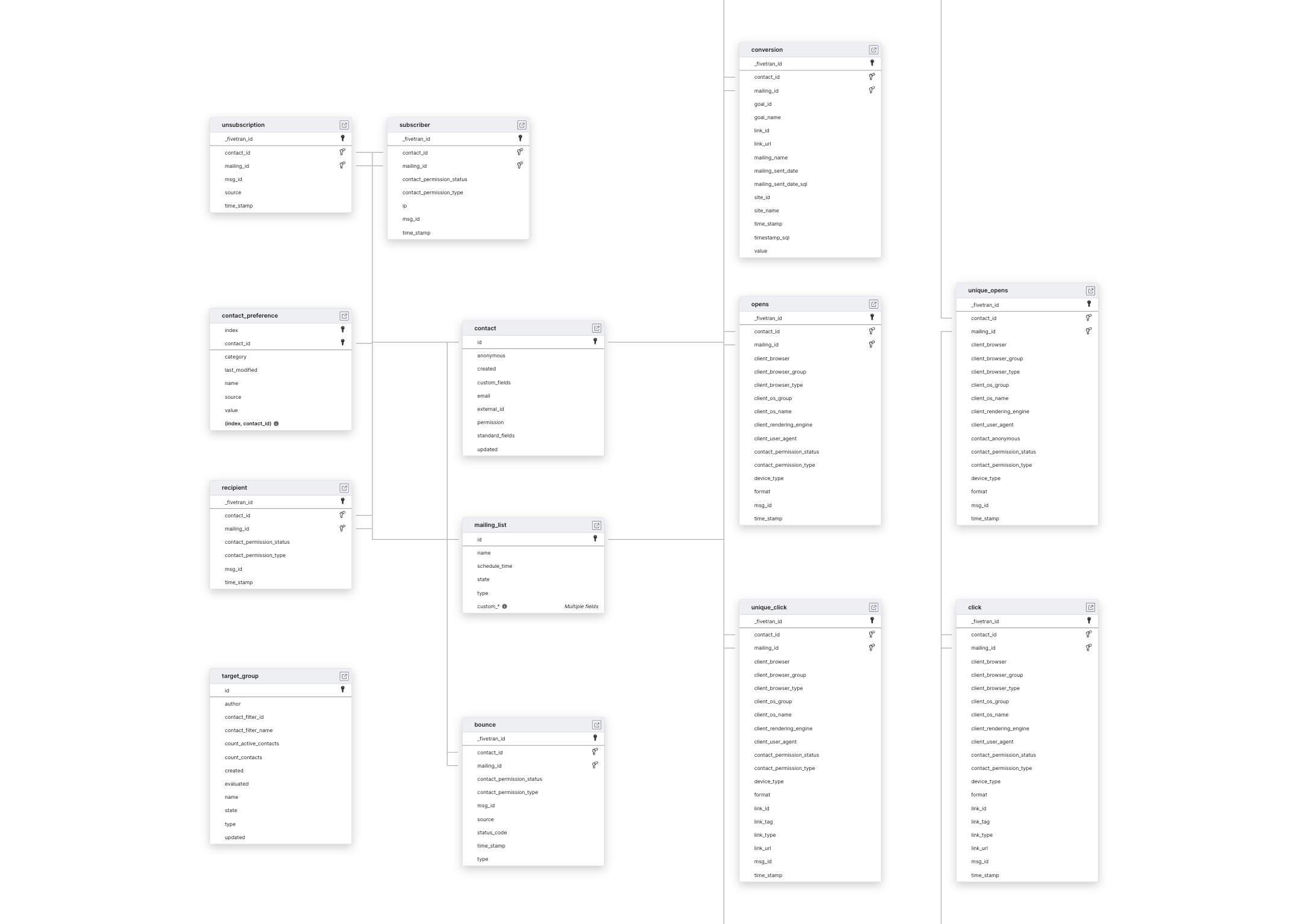 | Priority-first sync | check | BOUNCE, CLICK, CONTACT, CONVERSION, OPENS, RECIPIENT, SUBSCRIBER, UNIQUE_CLICK, UNIQUE_OPENS, and UNSUBSCRIPTION tables. |