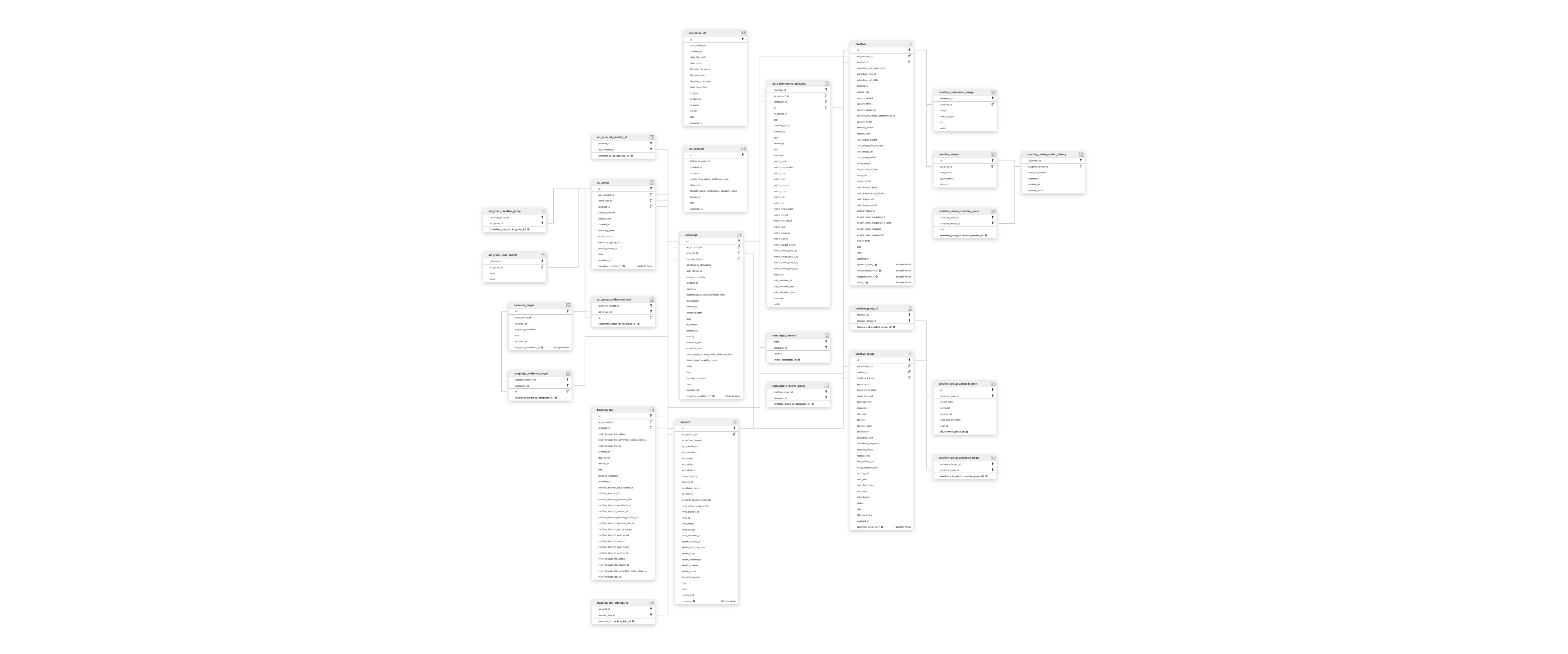 | Capture deletes | check | AD_ACCOUNT, AD_GROUP, AUDIENCE_TARGET, CAMPAIGN, CREATIVE, CREATIVE_GROUP, CREATIVE_REVIEW, CUSTOMER_SET, PRODUCT, and TRACKING_LINK tables. |