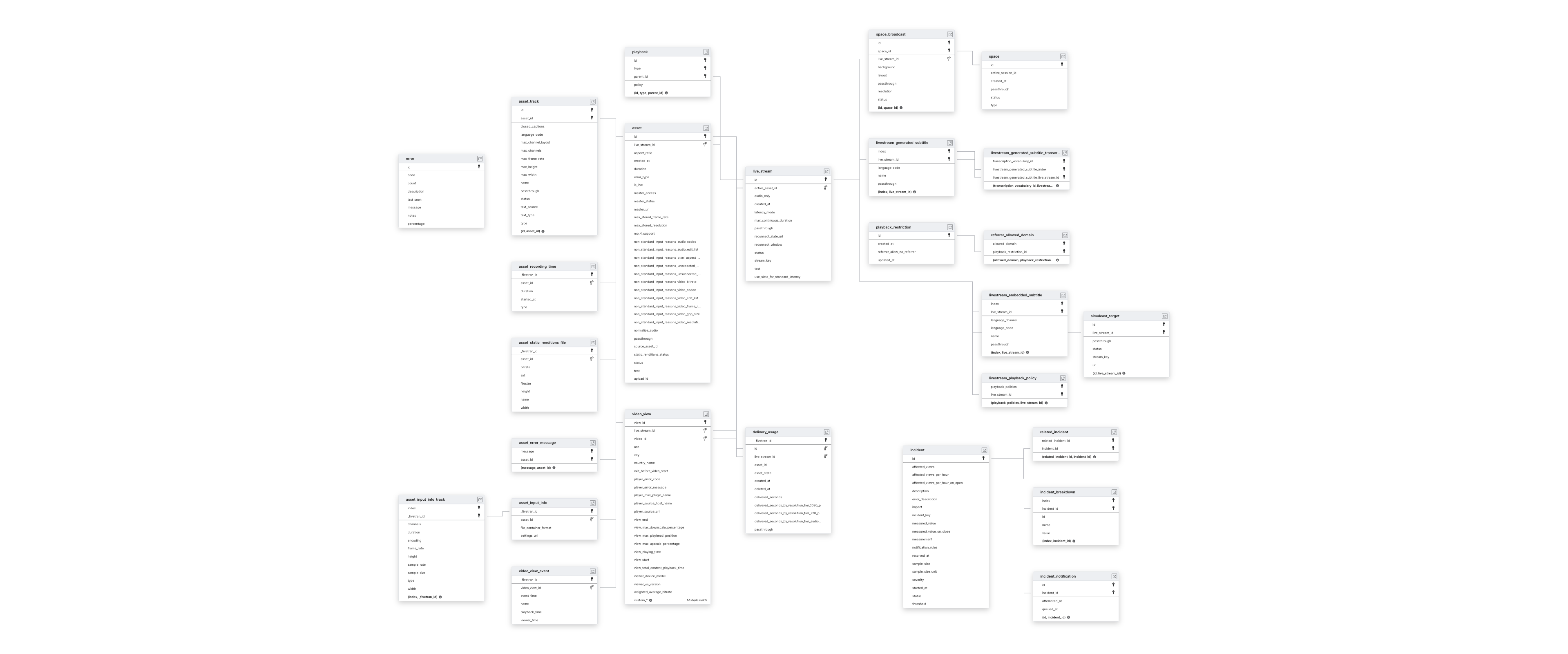 | Capture deletes | check | ASSET, ASSET_INPUT_INFO, DELIVERY_USAGE, INCIDENT,LIVE_STREAM, PLAYBACK_RESTRICTION, and RELATED_INCIDENT tables. |