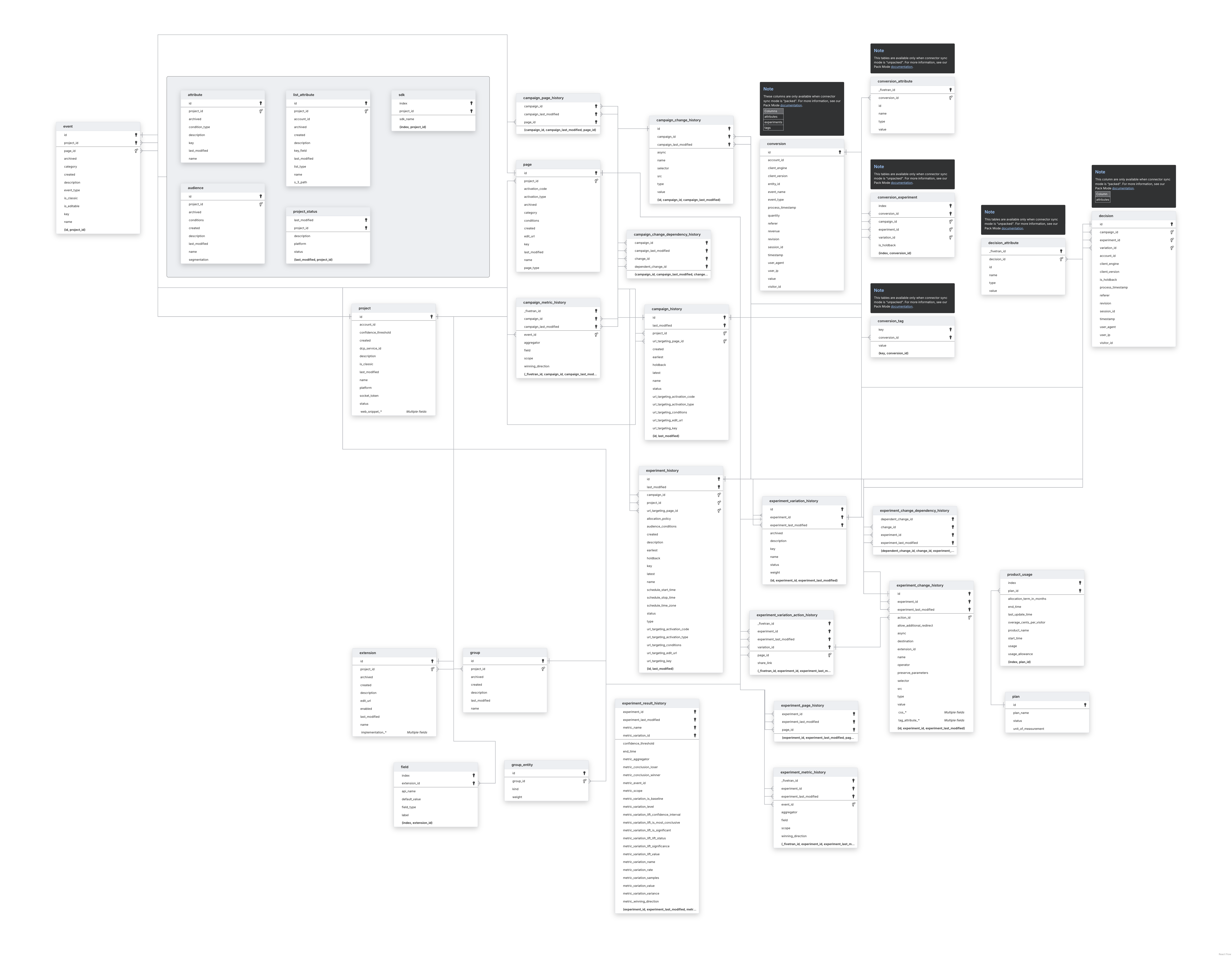 | History mode | check | CAMPAIGN_HISTORY, EXPERIMENT_HISTORY, CAMPAIGN_PAGE_HISTORY,CAMPAIGN_METRIC_HISTORY, CAMPAIGN_CHANGE_HISTORY, CAMPAIGN_CHANGE_DEPENDENCY_HISTORY, EXPERIMENT_VARIATION_HISTORY, EXPERIMENT_VARIATION_ACTION_HISTORY, EXPERIMENT_PAGE_HISTORY, EXPERIMENT_METRIC_HISTORY, EXPERIMENT_CHANGE_HISTORY, and EXPERIMENT_CHANGE_DEPENDENCY_HISTORY tables |
