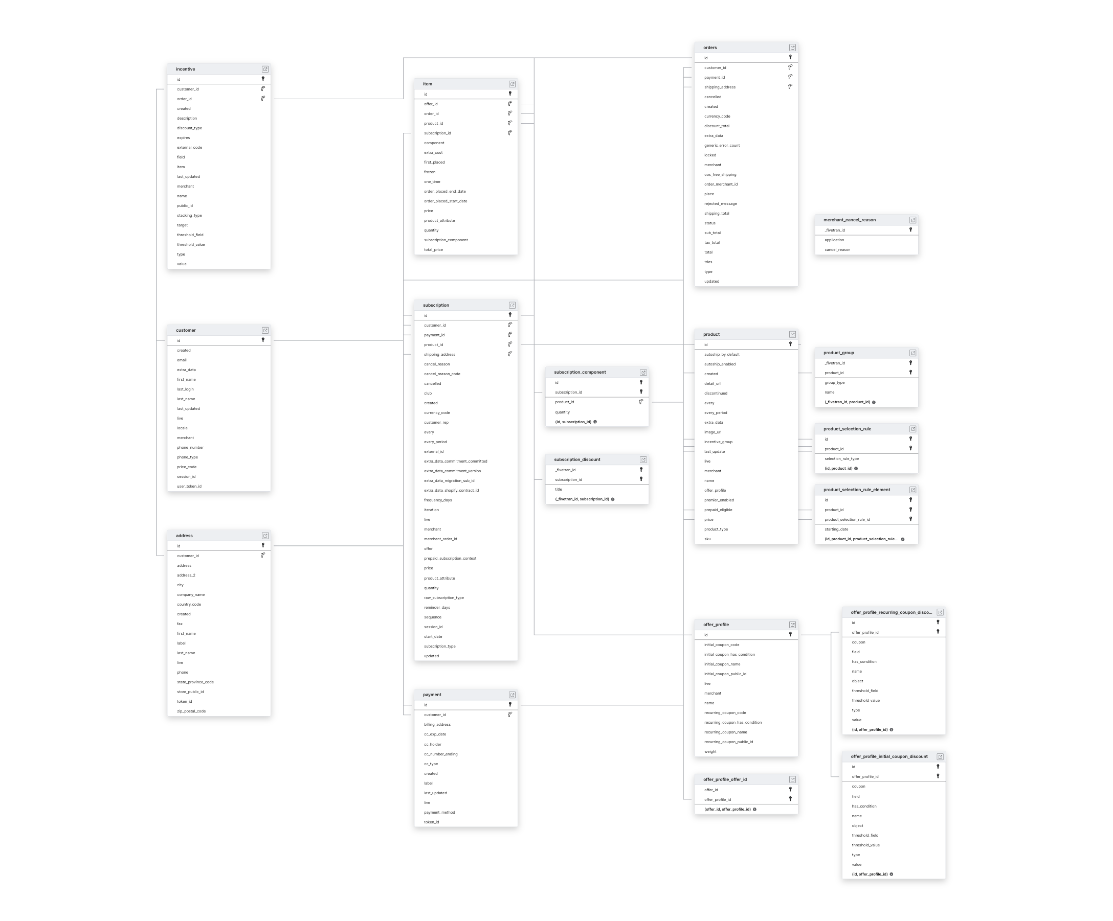 | Capture deletes | check | ADDRESS, CUSTOMER, INCENTIVE, MERCHANT_CANCEL_REASON, OFFER_PROFILE, PAYMENT, and PRODUCT tables. |