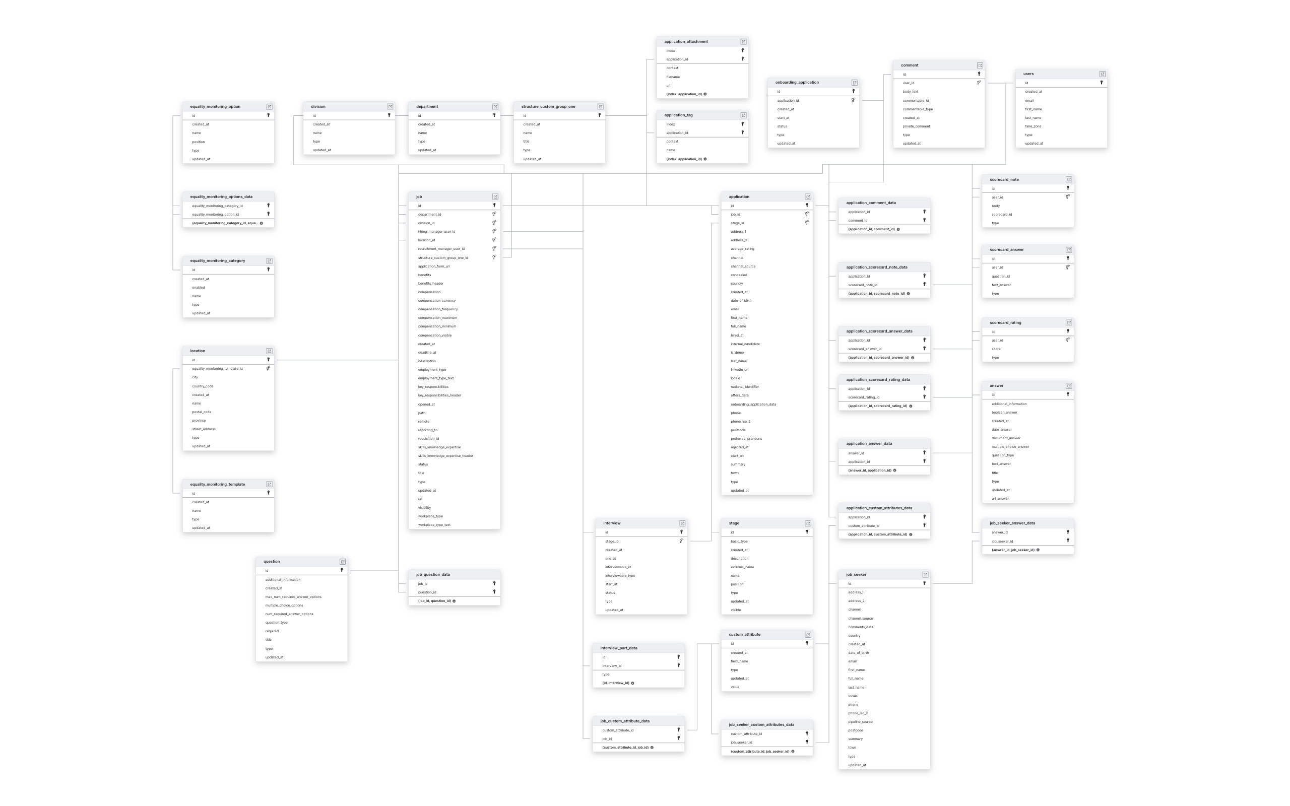 ANSWERAPPLICATIONCOMMENTCUSTOM_ATTRIBUTEEQUALITY_MONITORING_CATEGORYEQUALITY_MONITORING_OPTIONJOB_SEEKERONBOARDING_APPLICATIONSCORECARD_ANSWERSCORECARD_NOTESCORECARD_RATING