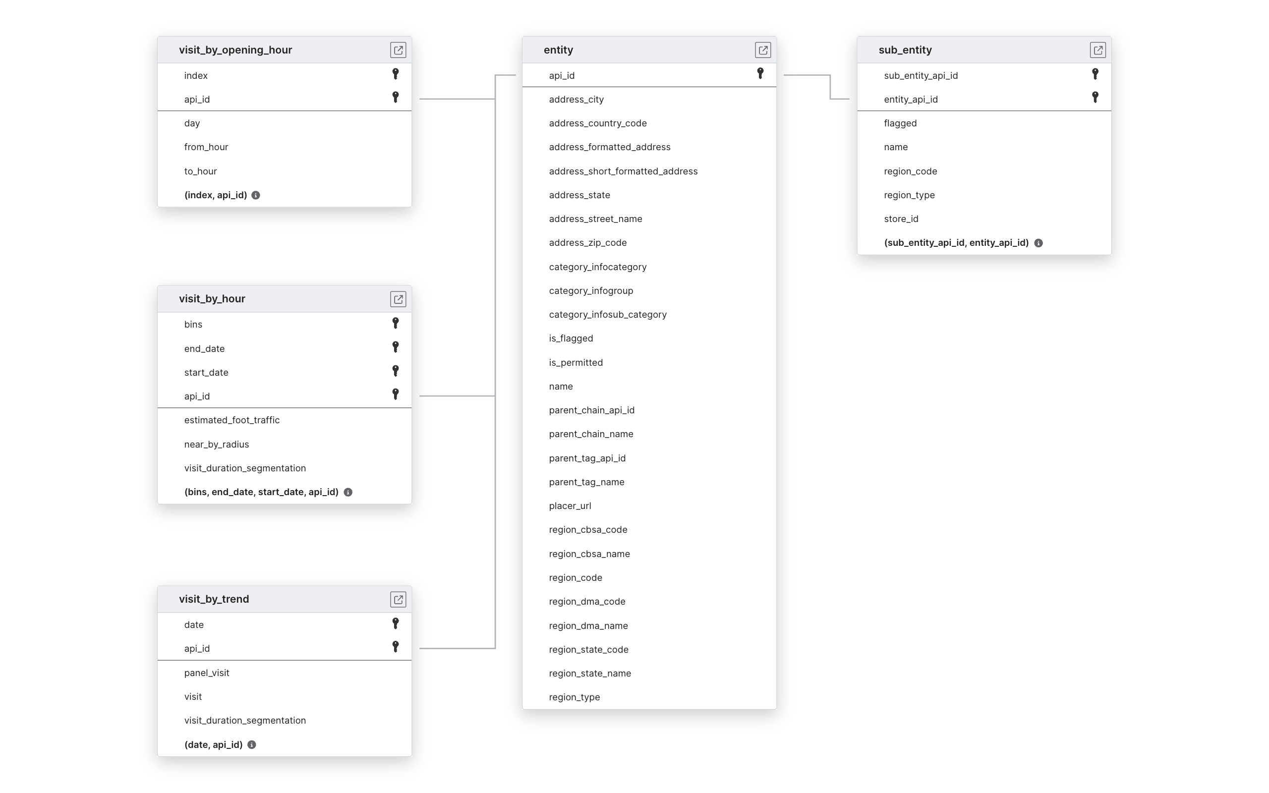 To capture new records, we incrementally sync the VISIT_BY_HOUR and VISIT_BY_TREND tables. We also re-import the VISIT_BY_TREND table once a week to capture updates.