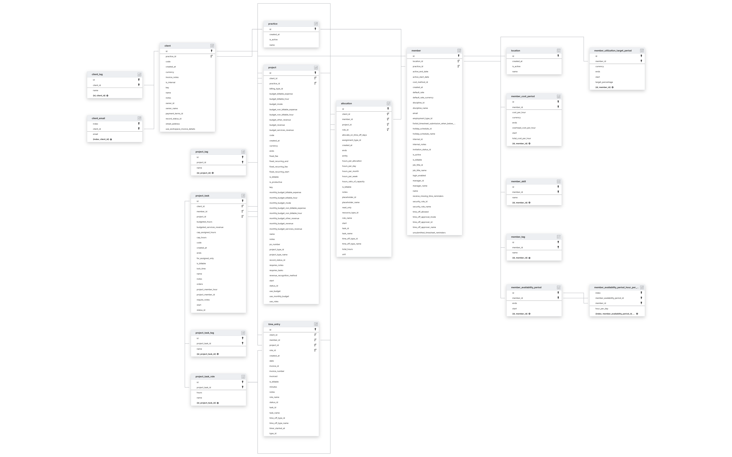 | Capture deletes | check | ALLOCATION, CLIENT, LOCATION, MEMBER, PRACTICE, PROJECT, PROJECT_TASK, and TIME_ENTRY tables and their child tables. |