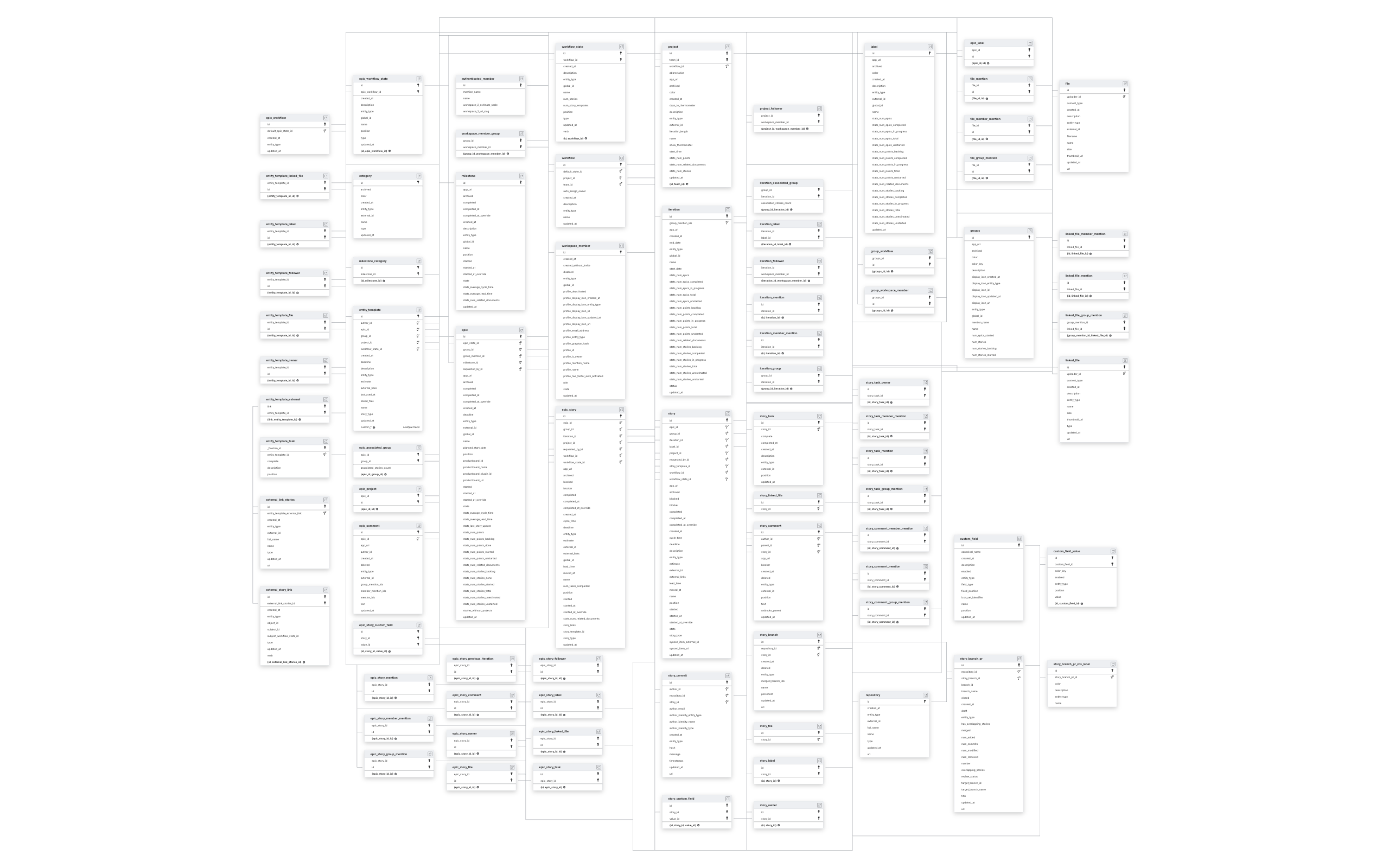 AUTHENTICATED_MEMBERCATEGORYCUSTOM_FIELDENTITY_TEMPLATEEPICEPIC_COMMENTEPIC_STORYEPIC_WORKFLOWEXTERNAL_LINK_STORIESFILEGROUPSITERATIONLABELLINKED_FILEMILESTONEPROJECTREPOSITORYWORKFLOWWORKSPACE_MEMBER