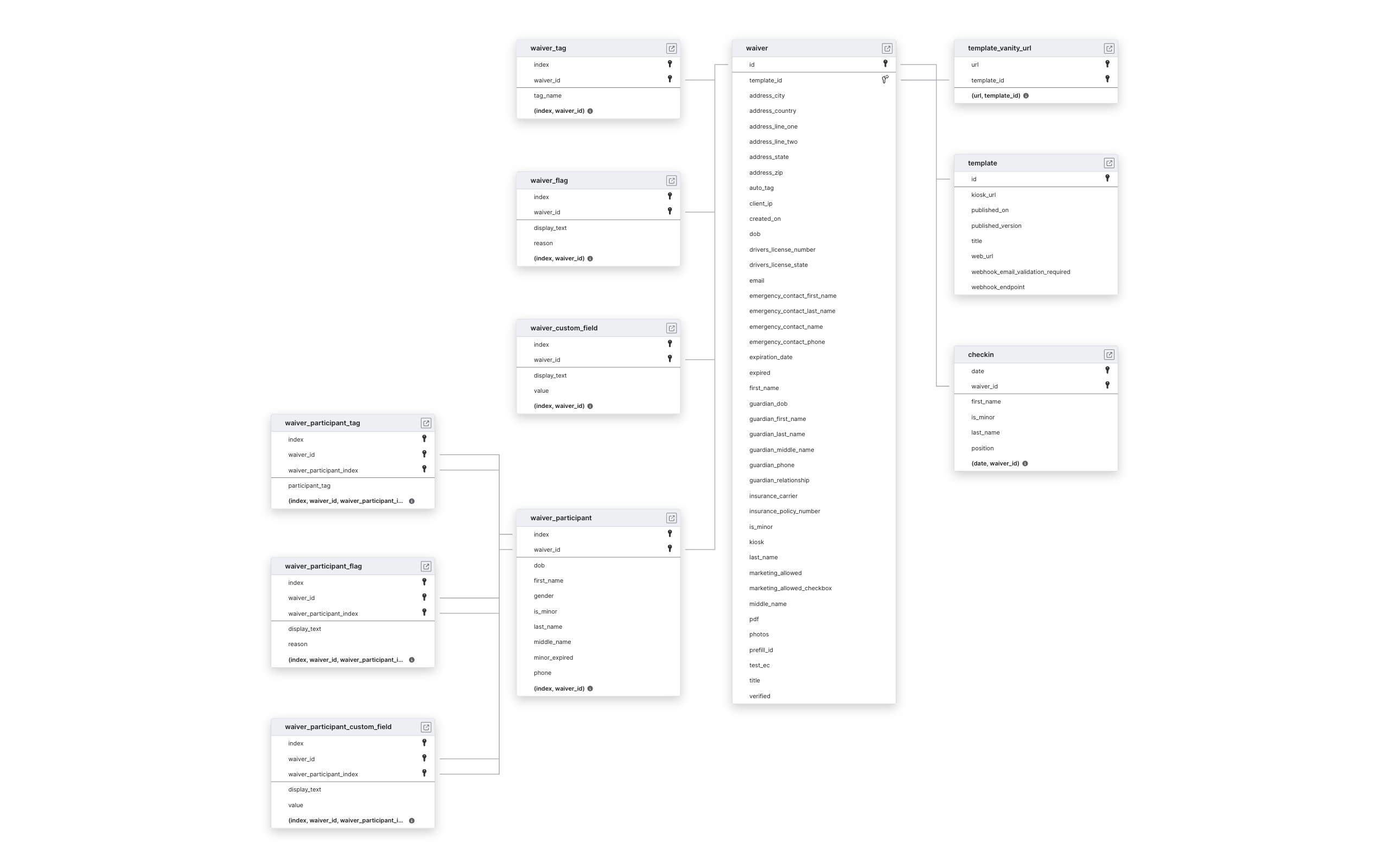 To capture new records, we incrementally sync the CHECKIN and WAIVER tables and their child tables.