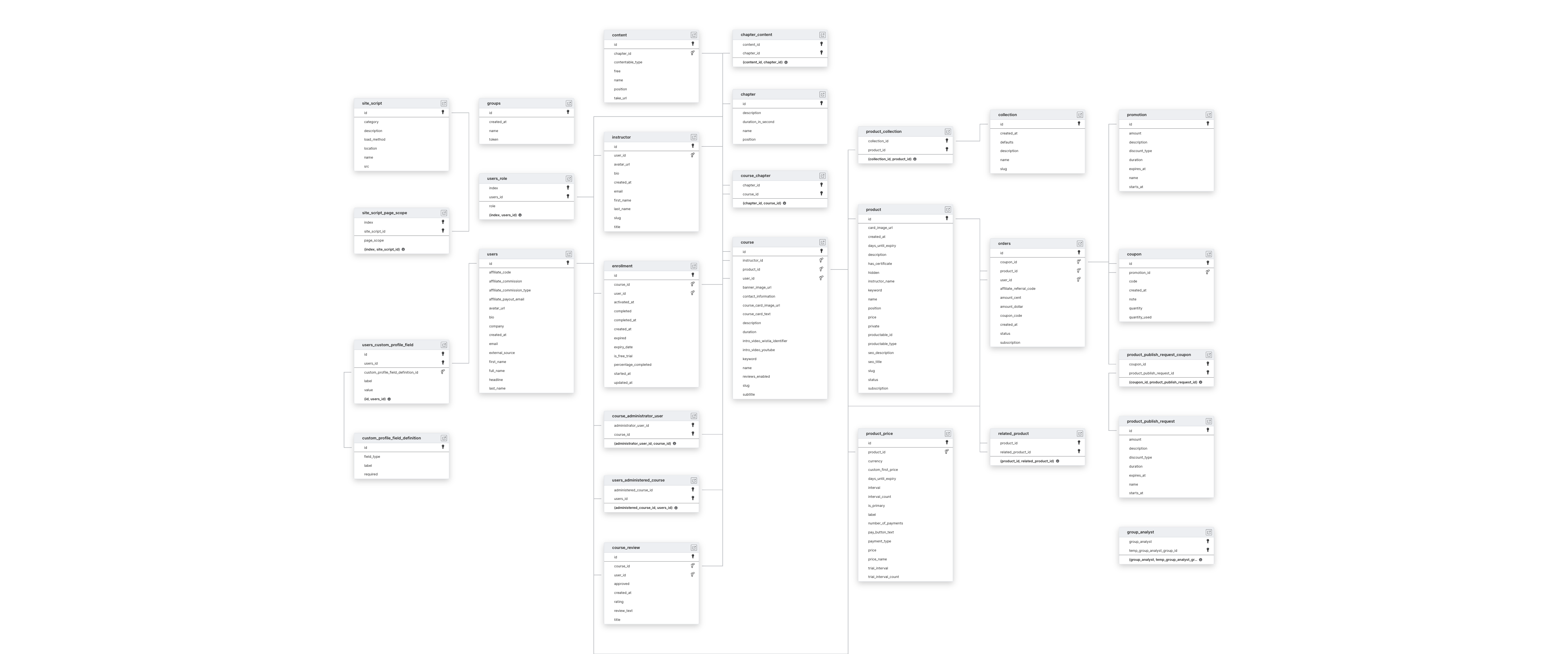 | Capture deletes | check | CHAPTER, COLLECTION, CONTENT, COURSE, COURSE_REVIEW, COUPON, CUSTOM_PROFILE_FIELD_DEFINITION, GROUPS, GROUP_ANALYST, INSTRUCTOR, ORDERS, PRODUCT, PRODUCT_PUBLISH_REQUEST, PROMOTION, SITE_SCRIPT, and USERS tables. |