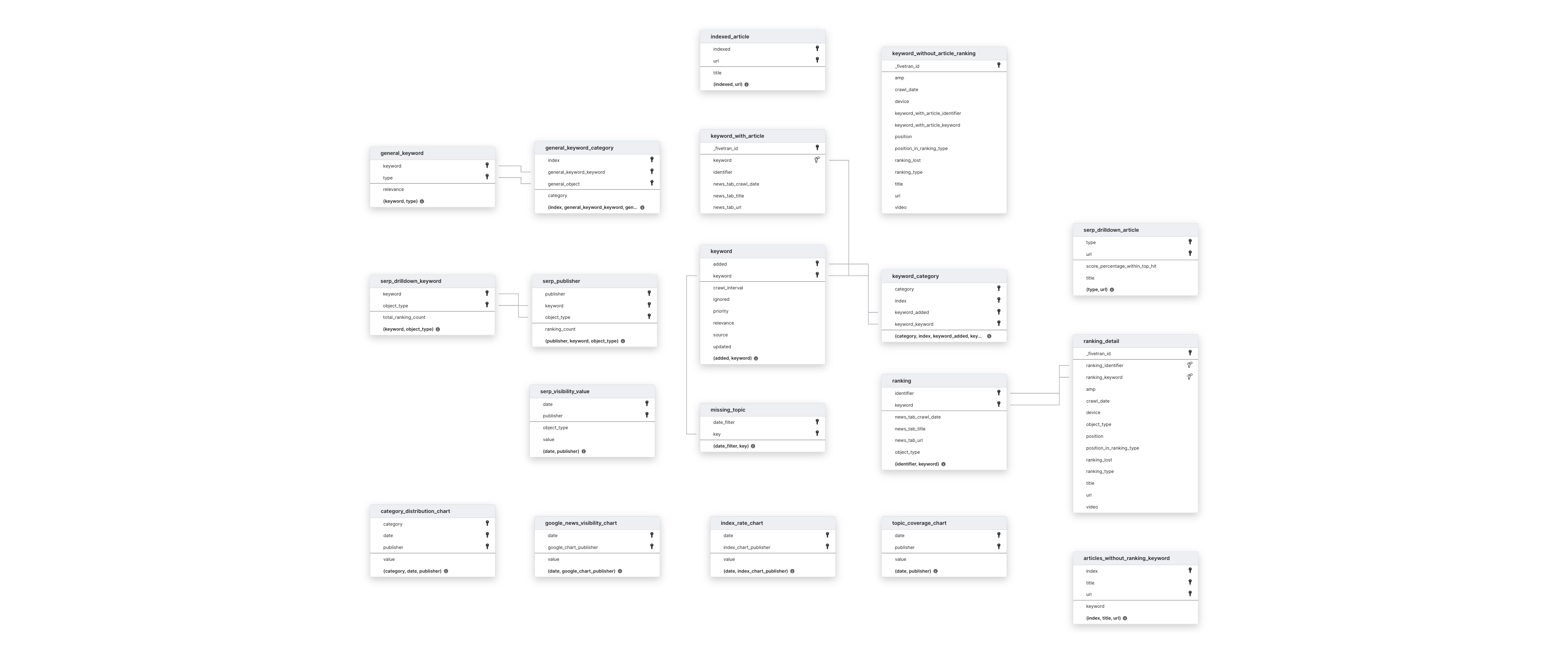 | Capture deletes | check | ARTICLES_WITHOUT_RANKING_KEYWORD, GENERAL_KEYWORD, GENERAL_KEYWORD_CATEGORY, INDEXED_ARTICLE, KEYWORD, KEYWORD_WITH_ARTICLE, MISSING_TOPIC, and RANKING tables and their child tables. |