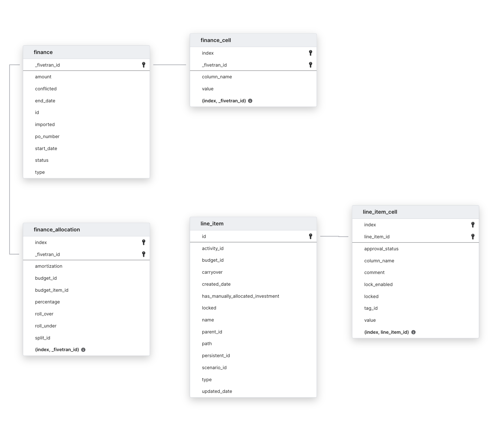To capture new records, we incrementally sync the FINANCE and LINE_ITEM tables and their child tables.