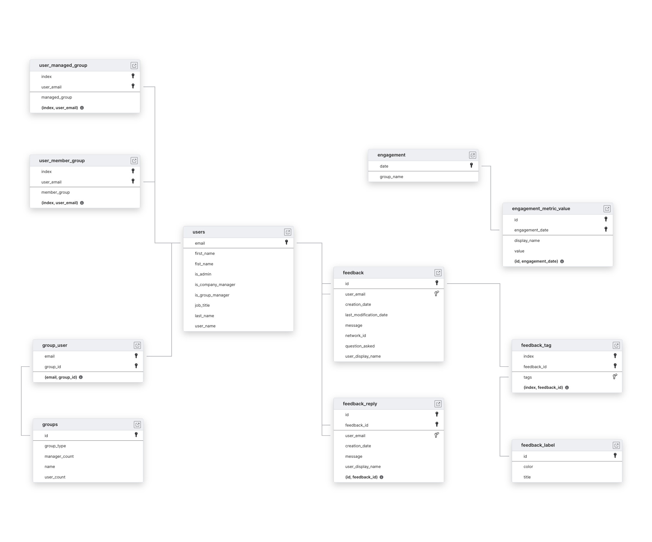 To capture new records, we incrementally sync the ENGAGEMENT and FEEDBACK tables and their child tables.