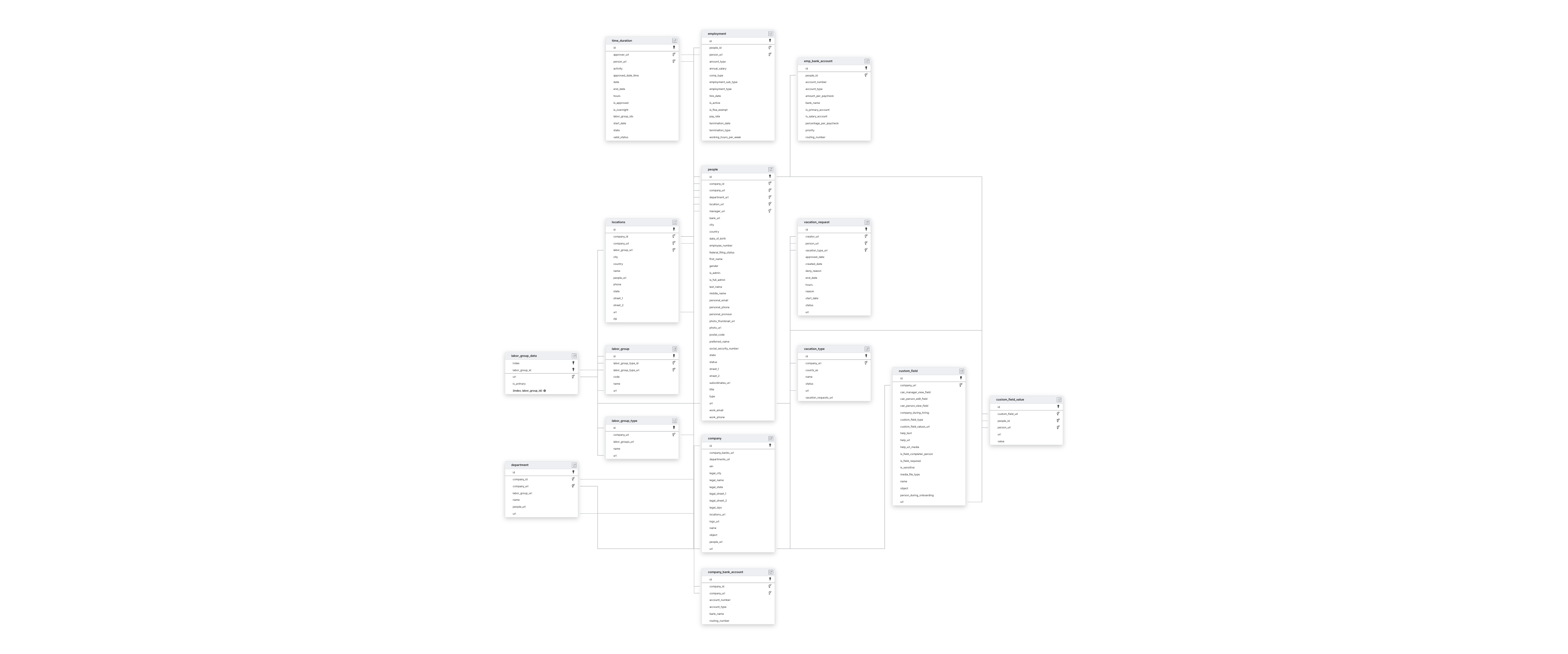 COMPANYCOMPANY_BANK_ACCOUNTCUSTOM_FIELDCUSTOM_FIELD_VALUEDEPARTMENTEMP_BANK_ACCOUNTEMPLOYMENTLABOR_GROUP_DATALABOR_GROUP_TYPELOCATIONSPEOPLEVACATION_TYPE