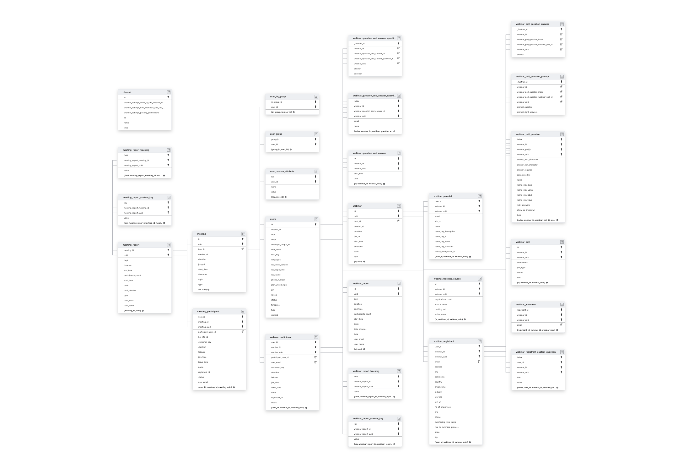 CHANNELUSERSWEBINARWEBINAR_ABSENTEEWEBINAR_CUSTOM_QUESTIONWEBINAR_PANELISTWEBINAR_PARTICIPANTWEBINAR_POLLWEBINAR_QUESTION_AND_ANSWERWEBINAR_REGISTRANTWEBINAR_REPORTWEBINAR_TRACKING_SOURCE