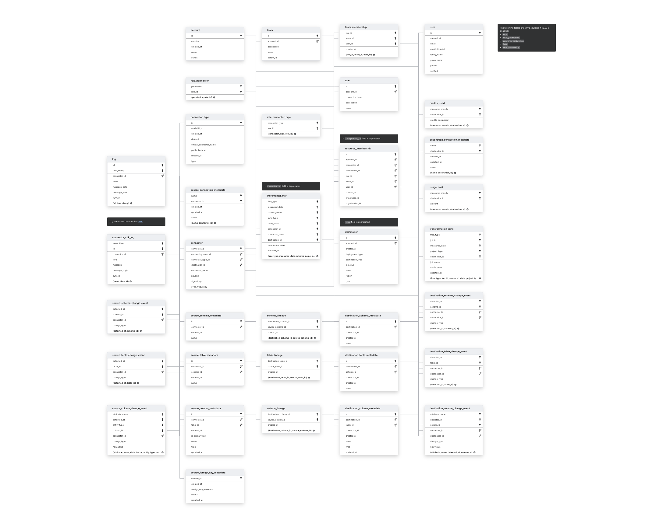 CONNECTORtable - This table has been deprecated and replaced byCONNECTIONtable.connector_namecolumn in theINCREMENTAL_MARtable - This column has been deprecated and replaced byconnection_name.connector_idcolumn in all applicable metadata tables - This column has been deprecated and replaced byconnection_id.